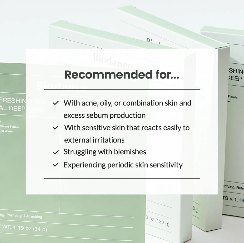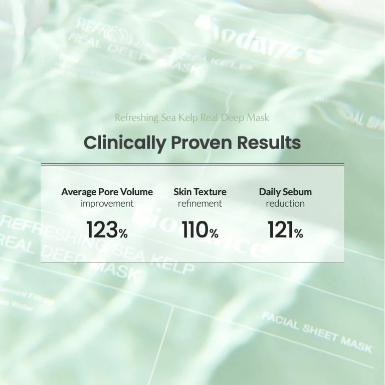 Biodance – Refreshing Sea Kelp Real Deep Mask indeholder havtang til at berolige og forfine huden, det hjælper også med at genoprette hudens olie-vand-balance. Især gavnlig til fedtet og akne-udsat hud.